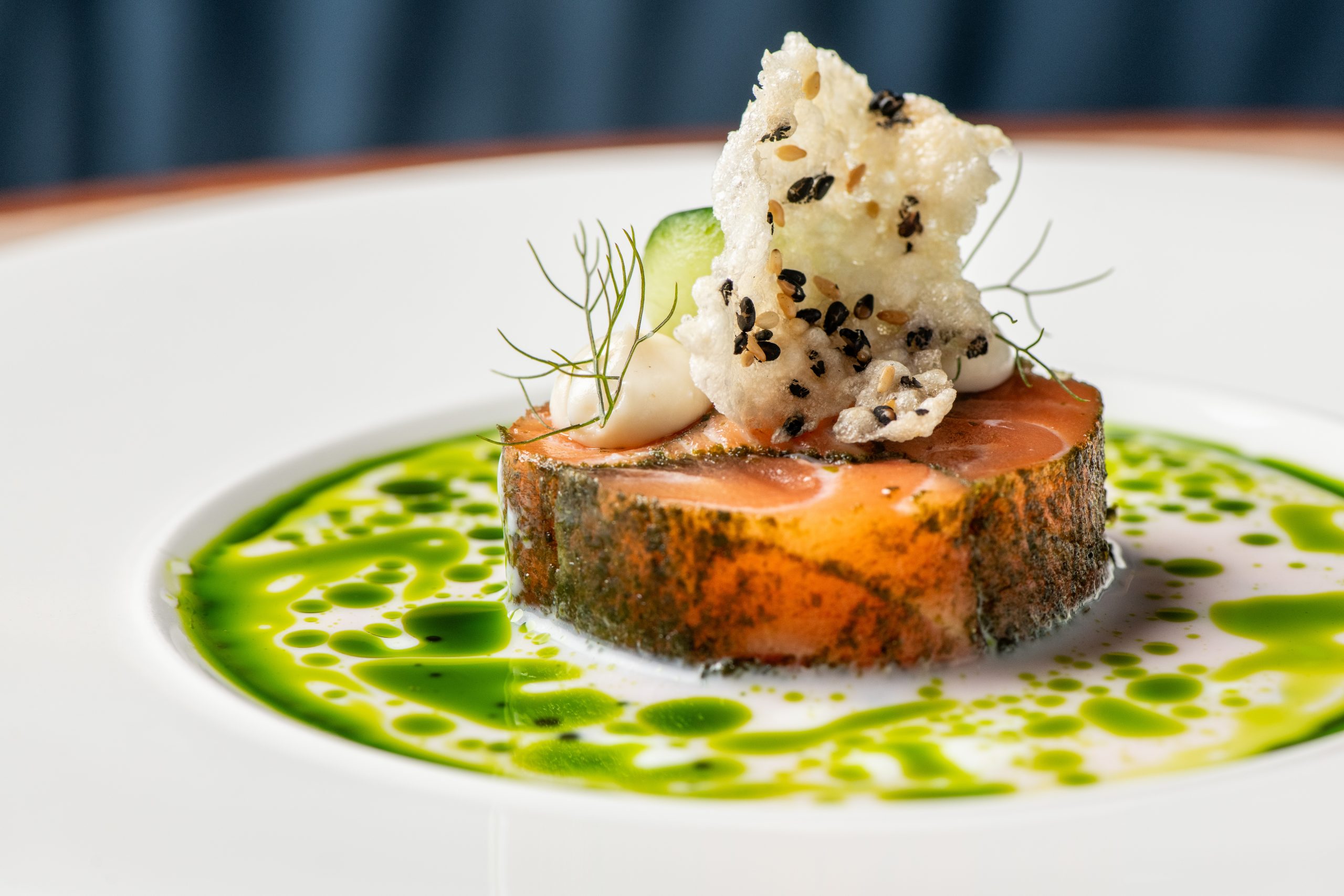 With pea and wasabi gremolata, tapioca nori cracker and pea shoots
